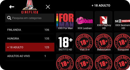 Toda a lista de canais adultos protegido com senha para bloqueio e segurança das crianças.